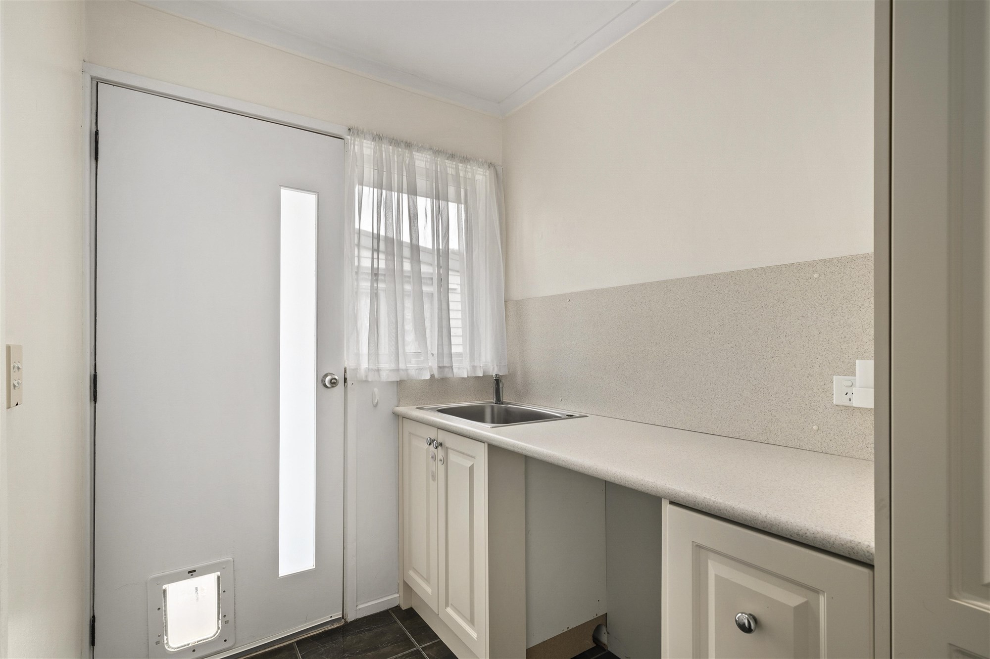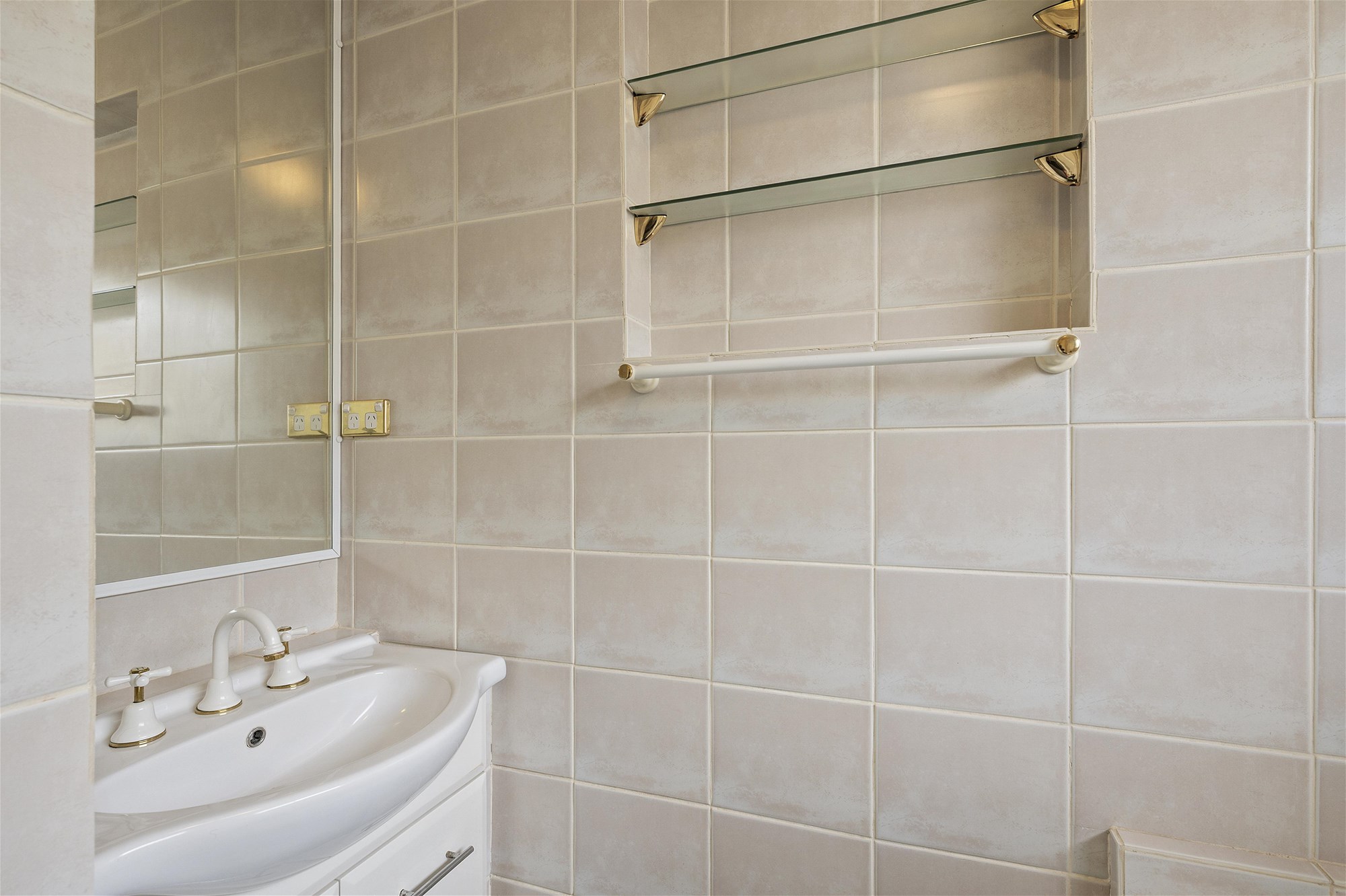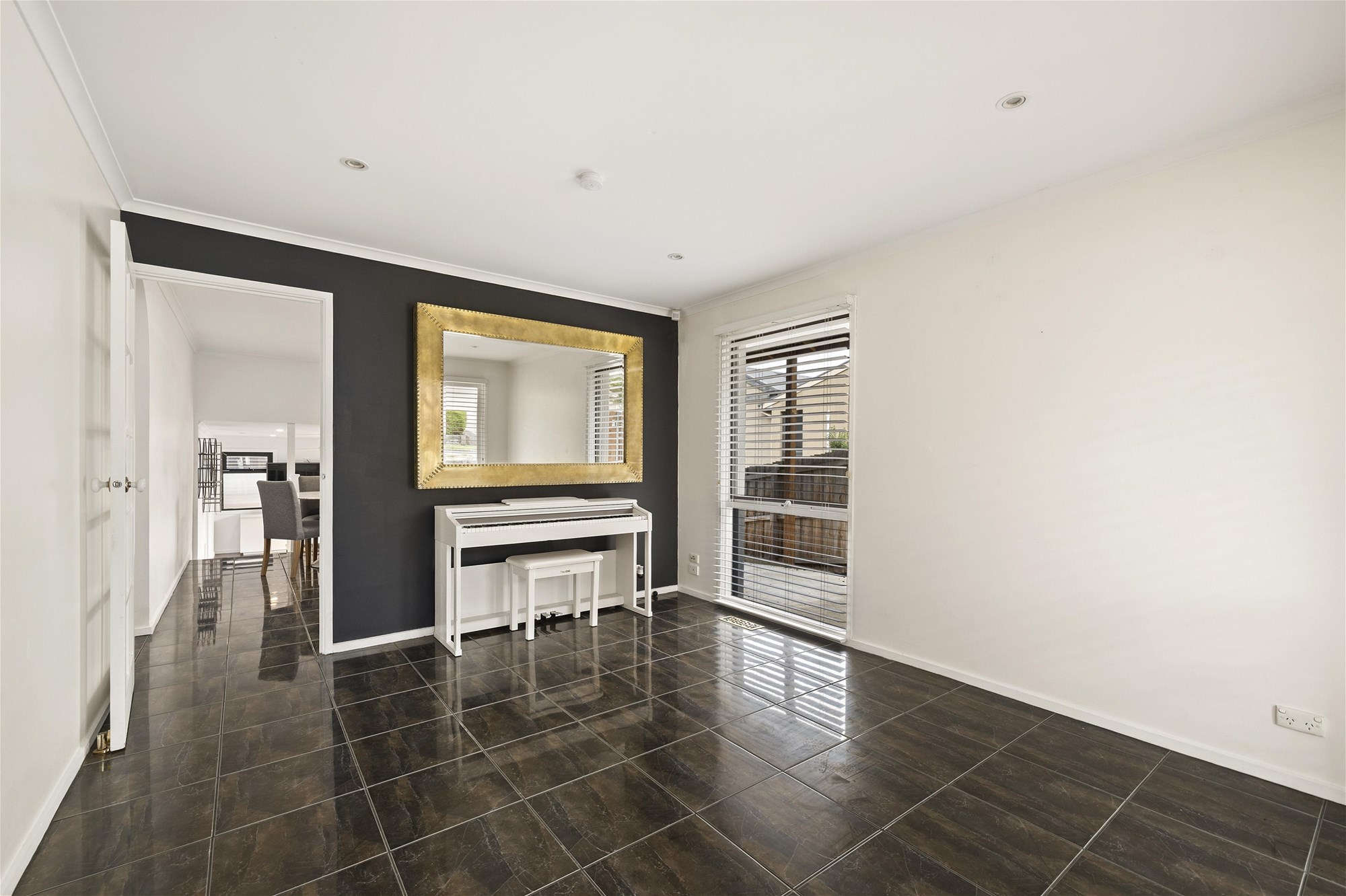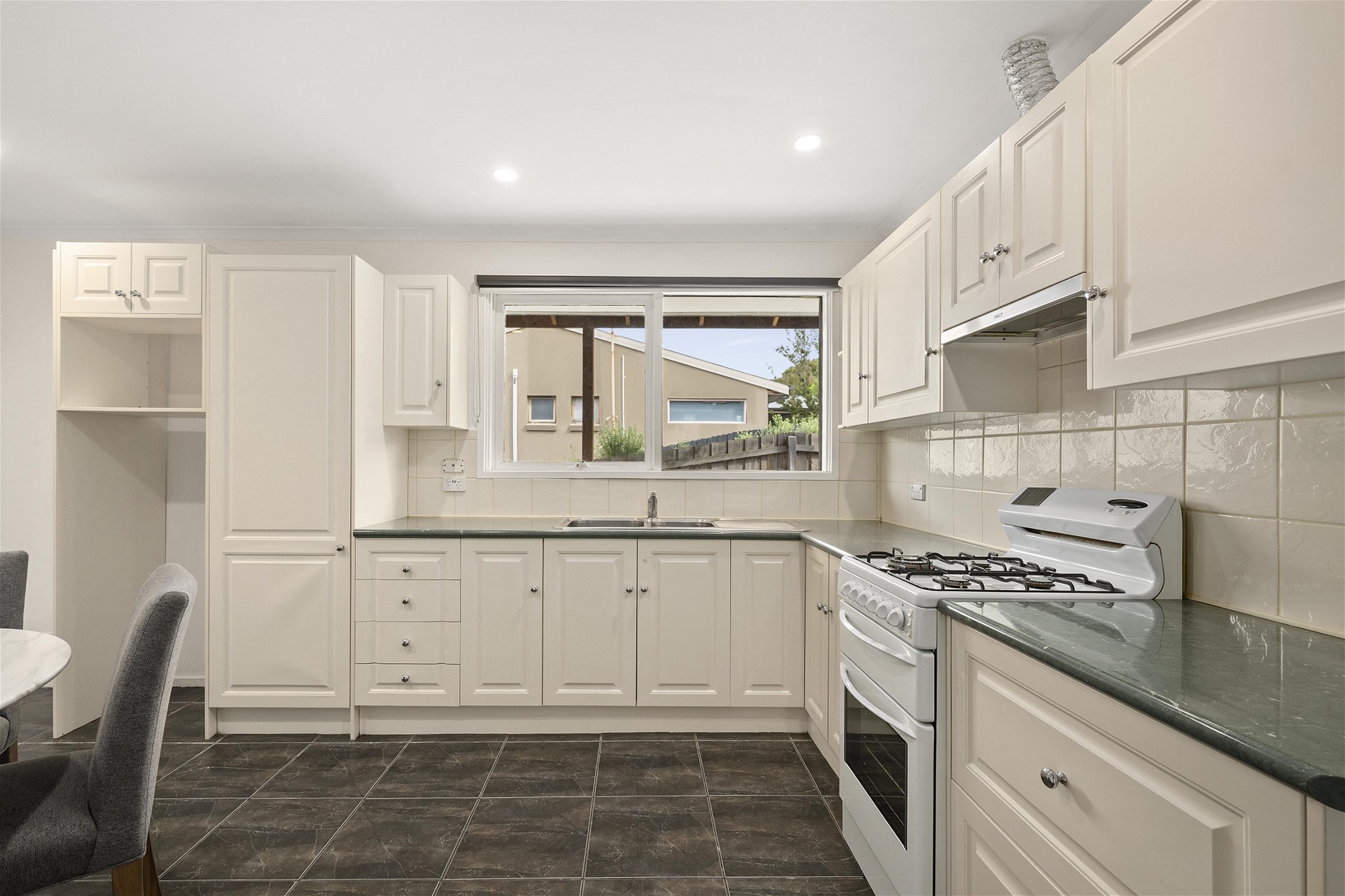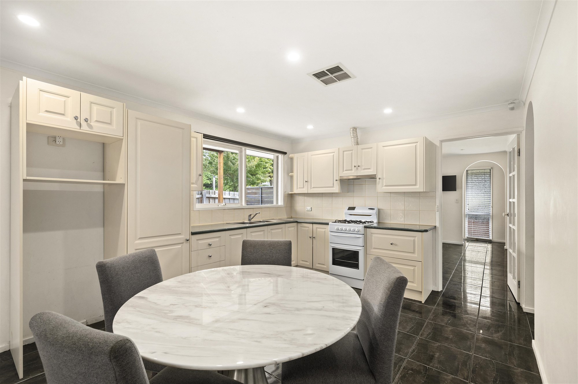 At the entrance, a versatile living zone is finished with glossy tiled floors and a feature wall. A French door draws you through to the kitchen/meals, where everyday life naturally gathers. Well-equipped with ample cabinetry and a gas upright cooker, it is functional for now with scope for updates when you’re ready.