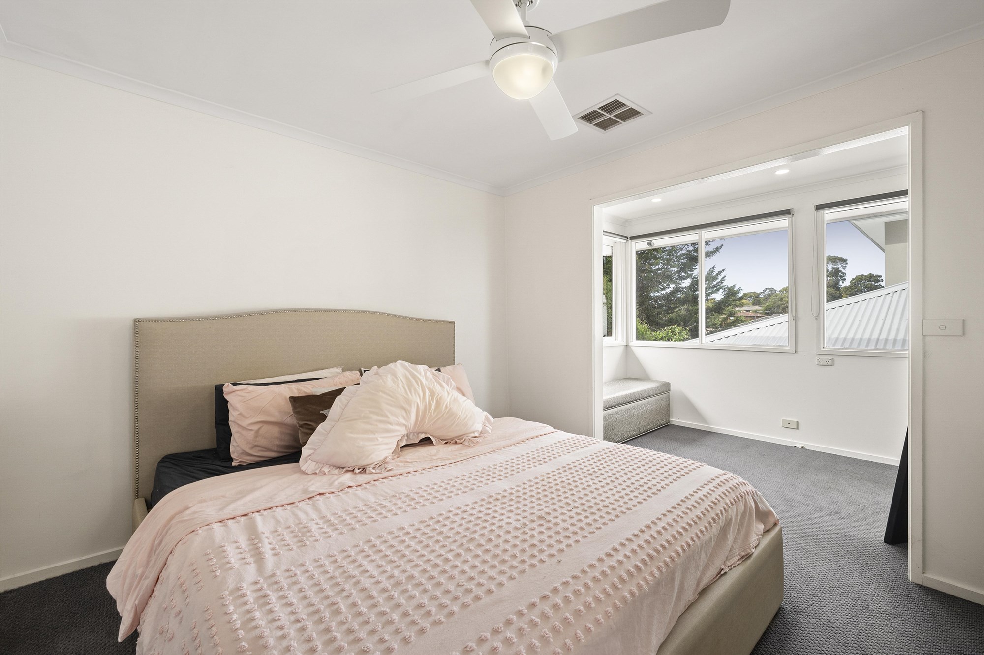 The main bedroom is privately positioned at the rear, offering a calm retreat complete with a walk-in robe designed for two and a sleek ensuite finished with floor-to-ceiling tiles. A sunlit adjoining nook adds flexibility, equally suited to a home office, reading corner, or nursery. Two additional bedrooms are serviced by a central bathroom featuring a shower over a spa bath that invites a slower pace when the day is done.