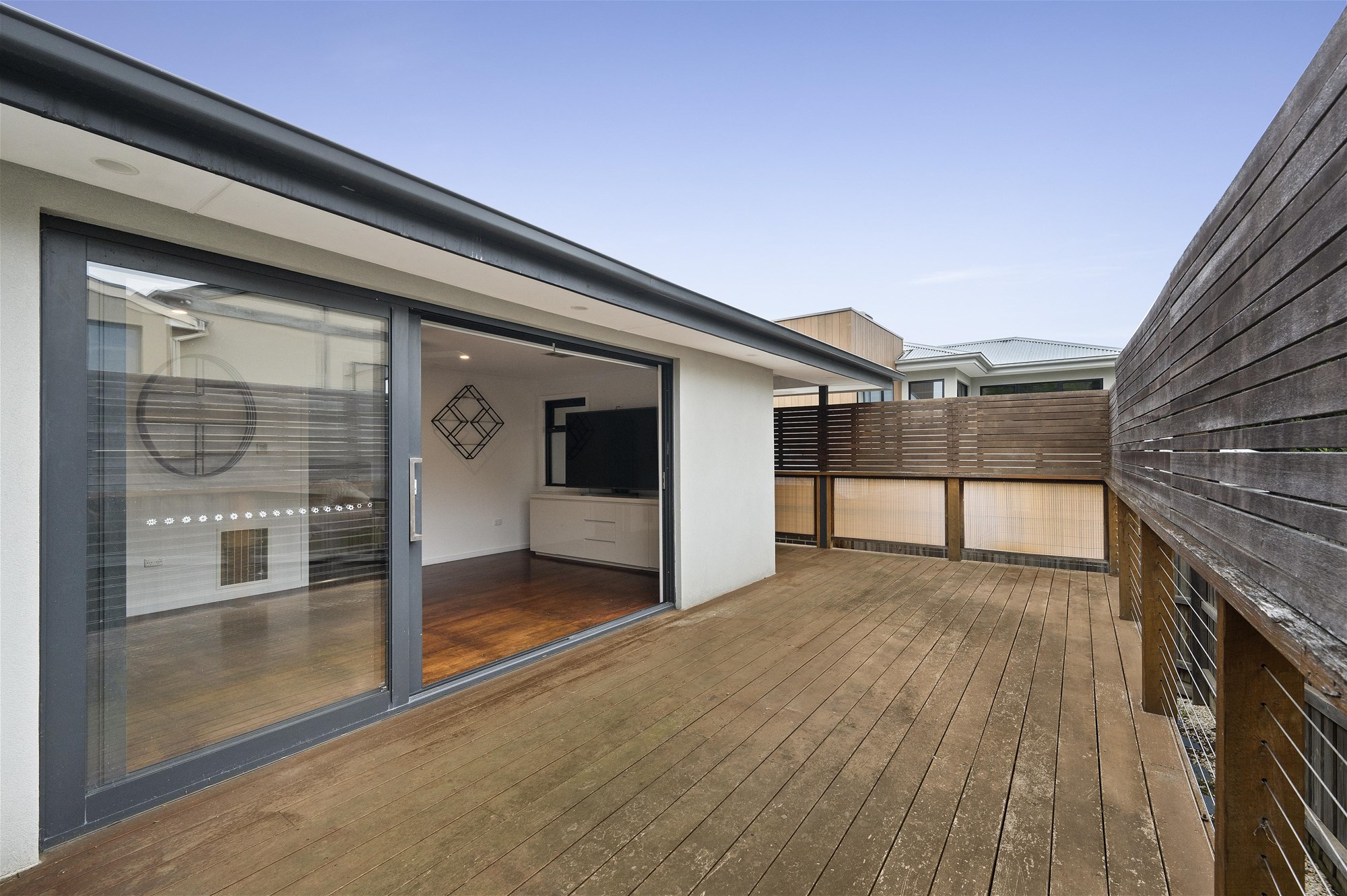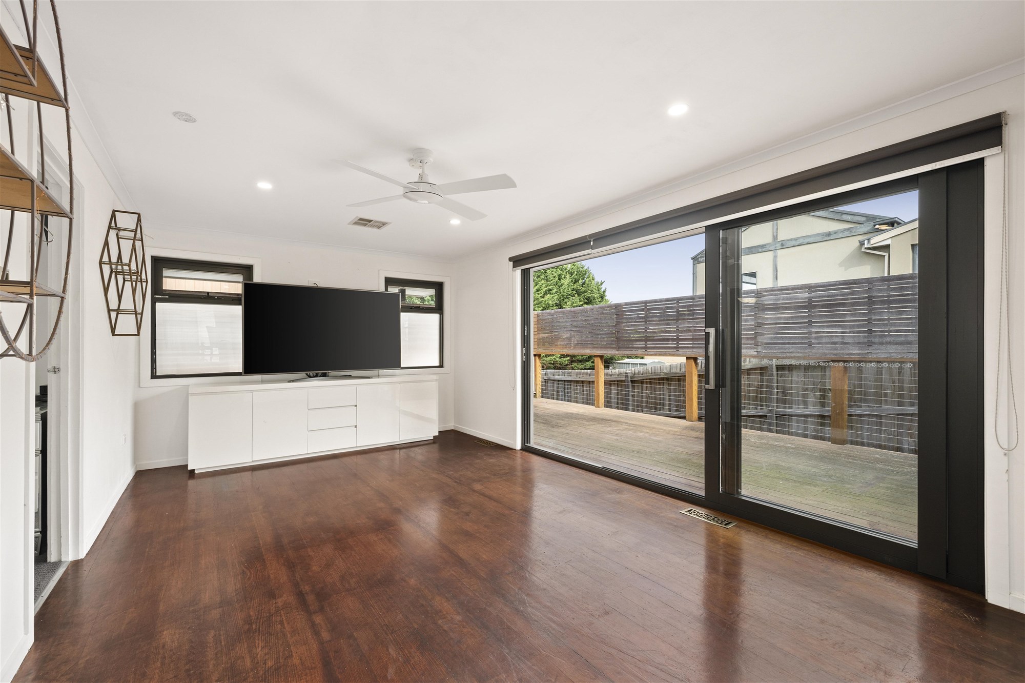A step down reveals the home’s true showpiece. The family room, warmed by rich hardwood floors and filled with natural light, opens wide via retractable doors to an expansive wrap-around deck that also features a covered alfresco corner. Here, the indoors and outdoors blur in the best way, with the deck connecting seamlessly to a pitched-roof carport to create one seriously impressive entertaining zone. It’s the kind of space that quietly takes over hosting duties…you just bring the people.